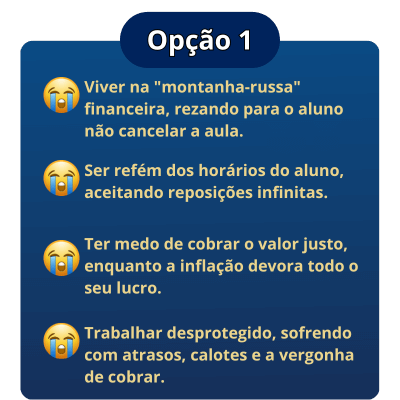 Como está a sua vida atualmente sem nenhuma previsibilidade de quanto e quando irá receber seu pagamento, sem saber quando serão as próximas férias, e sendo refém de alunos que marcam e desmarcam aulas quando bem entendem? Está ruim, não é?